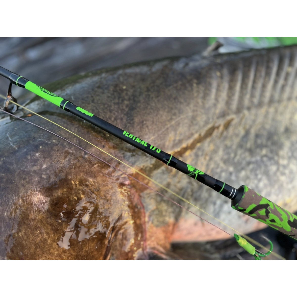 Corta e potente, con impugnatura posteriore corta—proprio come piace agli appassionati di pesca verticale! Carbonio 24T, blank monopezzo. Lunghezza canna: 1,75 m, azione: 50–150 g. UV-attiva, si illumina con una lampada UV (frontale).