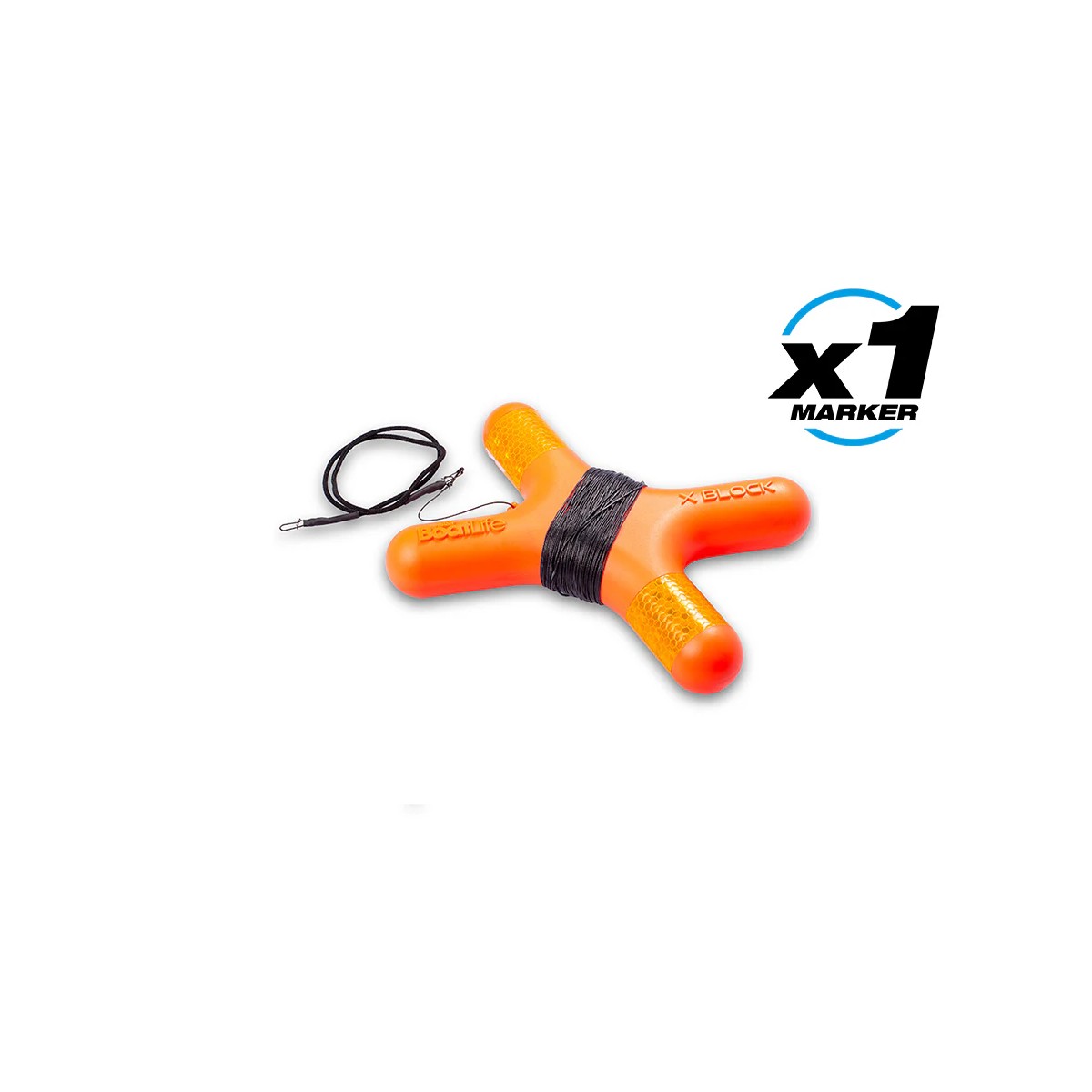 Munito di cordino di fissaggio agganciato al galleggiante l'X Block si regola automaticamente utilizzando una lunghezza di cordino elasticizzata per consentire al marker di rimanere sopra la superficie anche in caso di onde forti o se il livello dell'acqua aumenta mentre il marker è in posizione.