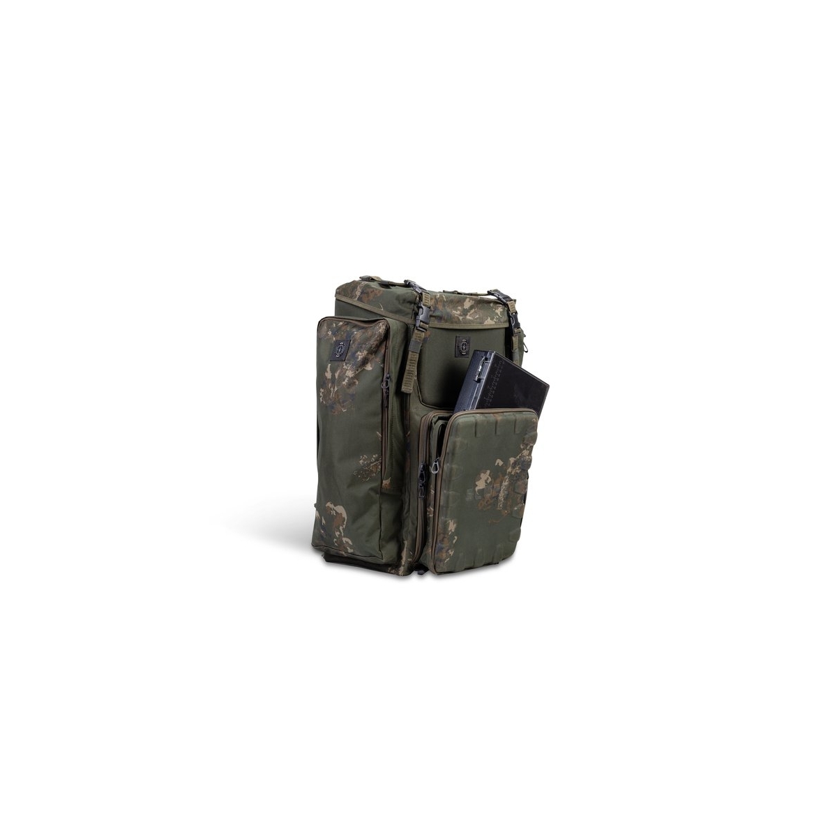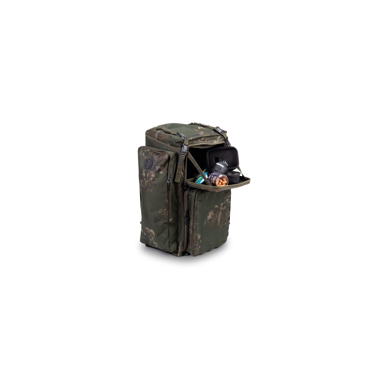 Una tasca frontale in EVA più grande contiene una Large Tackle Box e le cerniere rivelano un accesso generoso al contenuto dello scomparto principale.